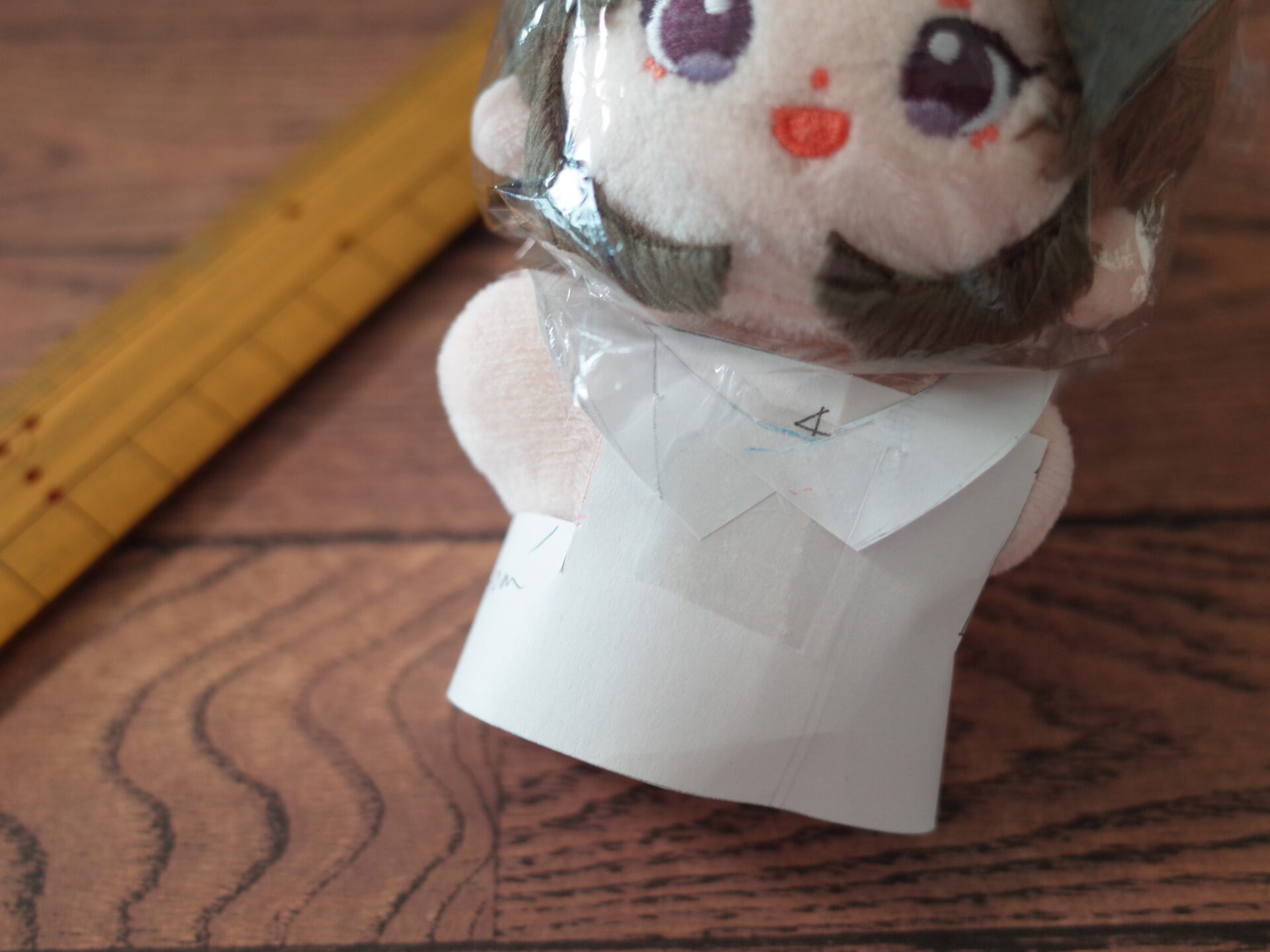 実際に紙を当てながら、腕を通すための四角い切り抜き(2センチ)・前襟の合わせ部分(1.5センチ)・後ろ襟の長さ(2.8センチ)などを採寸&調整。